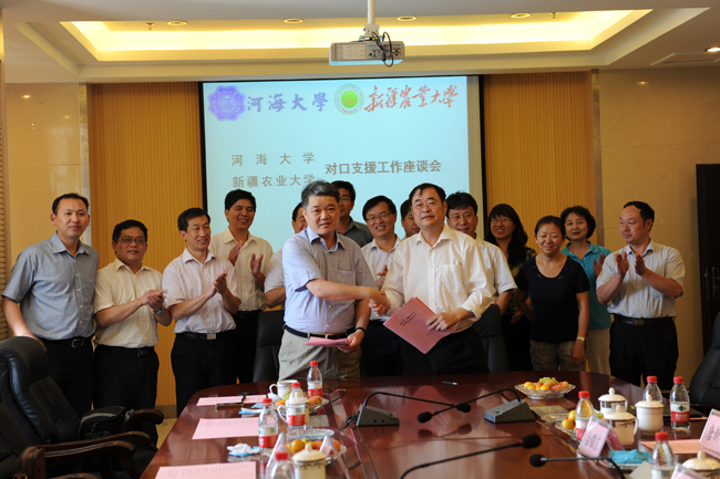 7月19日,河海大学与新疆农业大学签订“十二五”对口支援意向书,新疆农业大学雒秋江校长、蒋平安副校长热情接待了我校王乘校长和李乃富副校长一行。王乘校长和雒秋江校长共同签署对口支援意向书。
