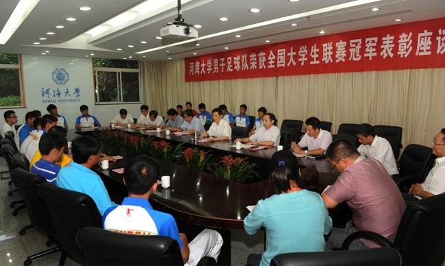 9月5日,我校举行校男子足球队荣获全国大学生联赛冠军表彰座谈会。校党委书记朱拓、党委副书记王济干出席座谈会。校足球队领队、教练员和全体队员,学生和教工球迷代表,宣传部、教务处、学生处、团委、商学院、公管院等有关职能部门和学院负责人参加座谈。会议由王济干副书记主持。