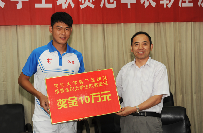 王济干副书记宣读了学校《关于奖励河海大学男子足球队的通知》,并为足球队颁奖。王济干副书记强调要求,足球队要铭记朱拓书记提出的三点希望,做好河海学生的代表,把我们的团队打造成一个优秀的团队。同时他也预祝同学们在大运会中取得好成绩。