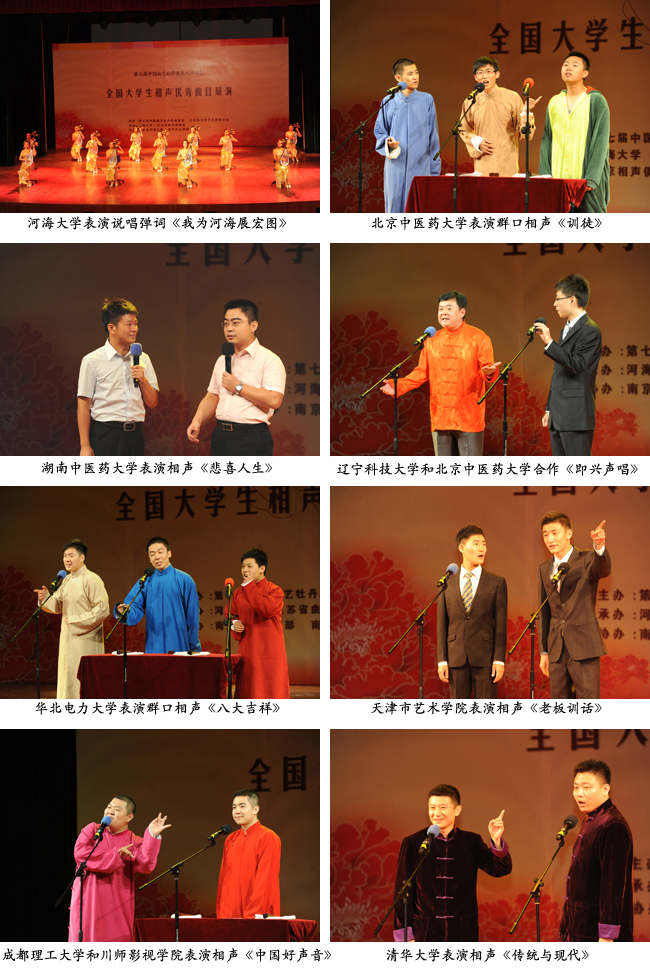来自清华大学、华北电力大学、北京中医药大学、天津艺术学院、湖南中医药大学、成都理工大学、辽宁科技大学和河海大学等高校的学子们表演了精彩纷呈的节目。说唱弹词《我为河海展宏图》、相声《传统与现代》、《八大吉祥》、《中国好声音》等节目展现了青年学生对曲艺的热忱和文艺风采,富有校园生活气息的“包袱”颇有喜剧效果,引得现场笑声不断、掌声不绝。