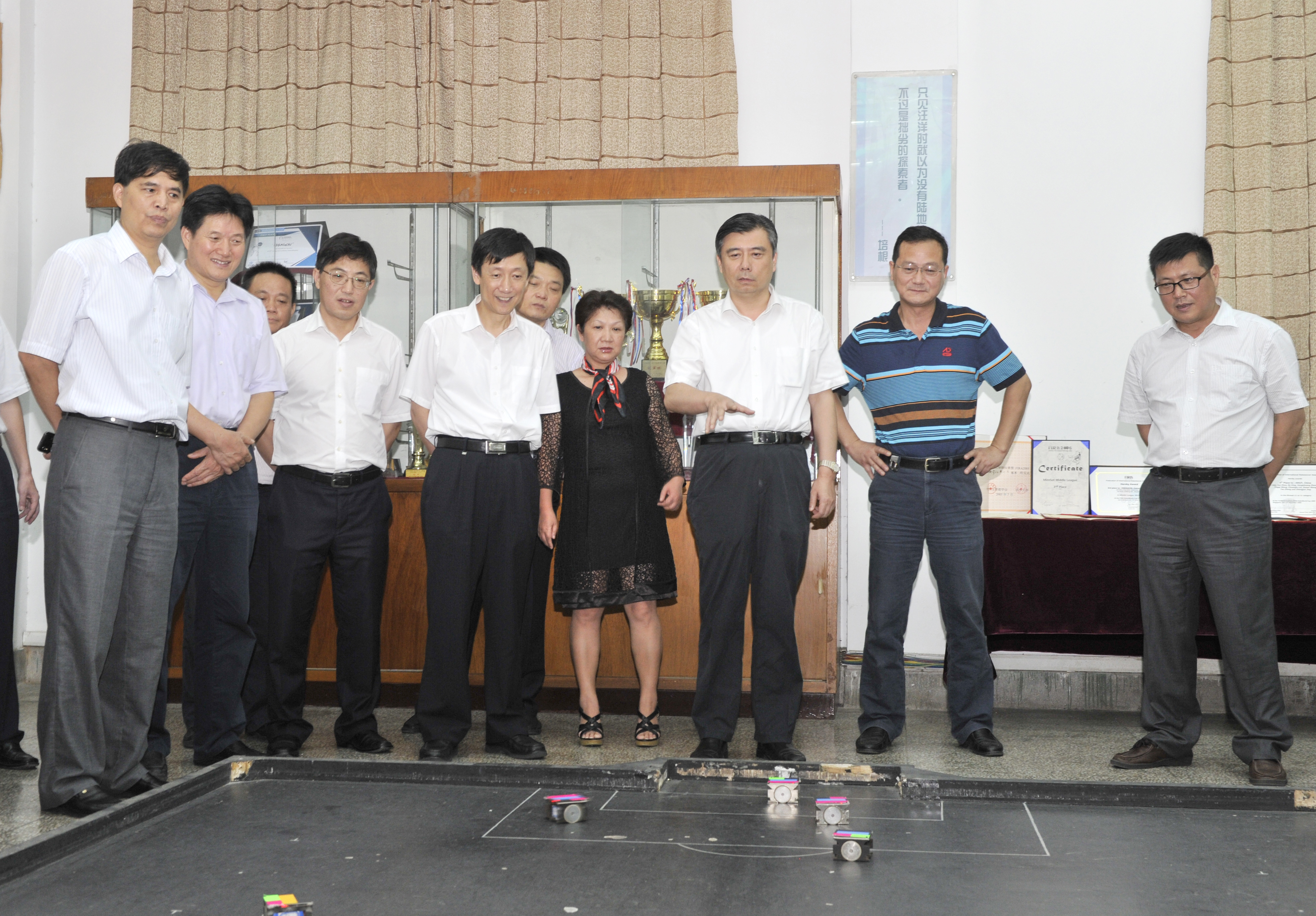 阎立书记(右三)在朱拓书记(右六)和陈德奎副书记(右九)的陪同下参观我校机器人创新实验室
