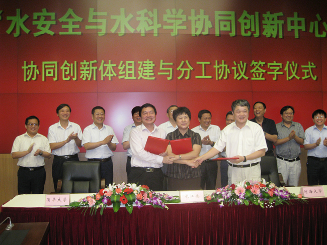 河海大学王乘校长、长江水利委员会蔡其华主任、清华大学土木水利学院陈永灿院长共同签署了“水安全与水科学协同创新中心”协同创新体组建与分工协议。
