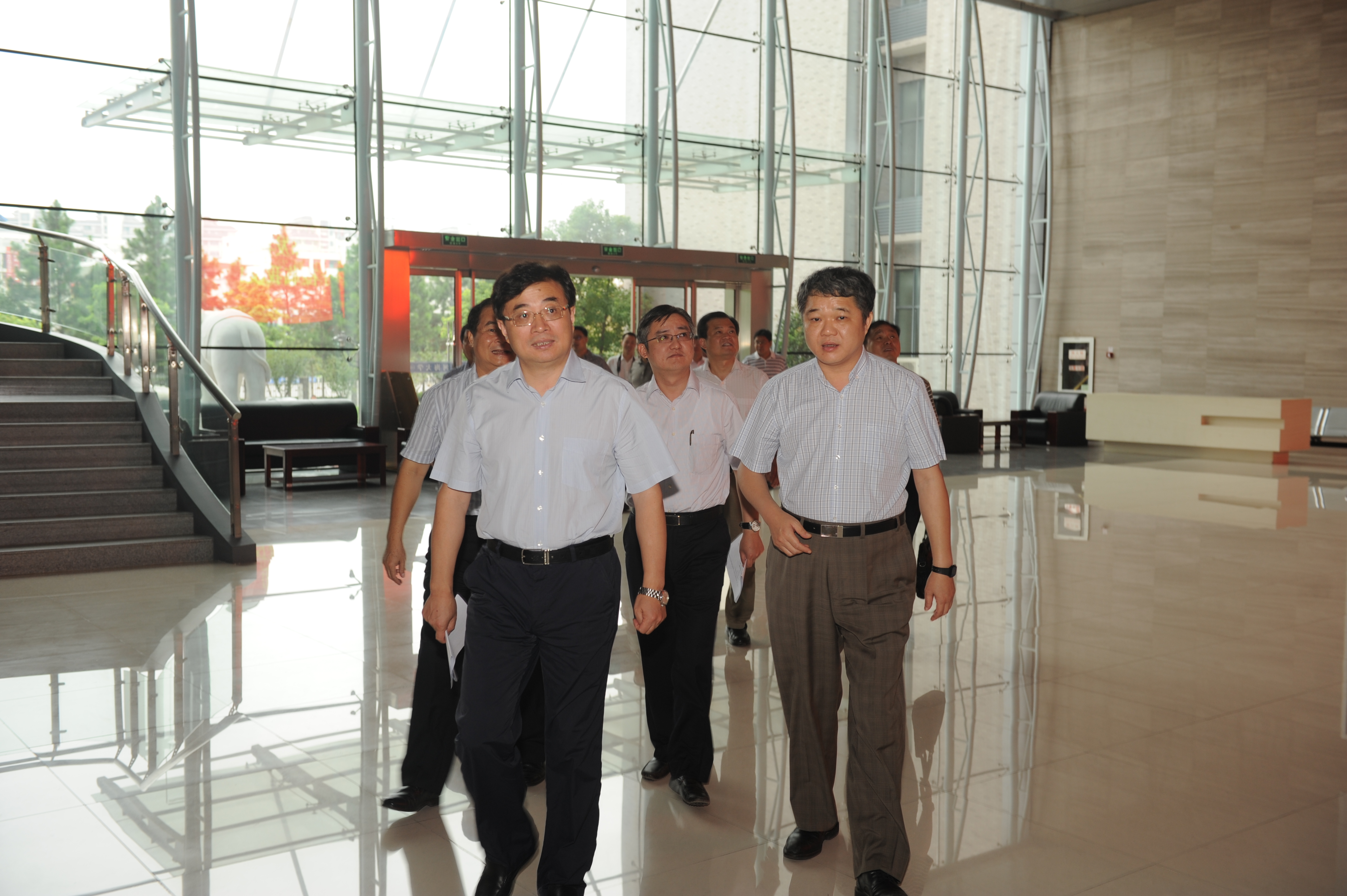 王乘校长(前排右一)等校领导热情接待陈发喜区长(前排右二)一行