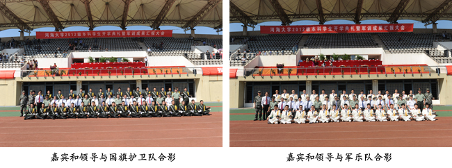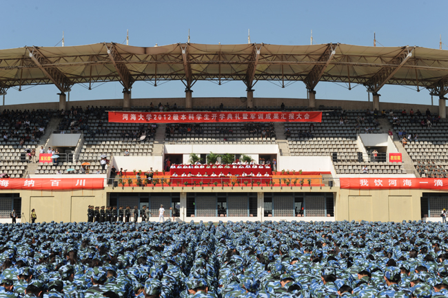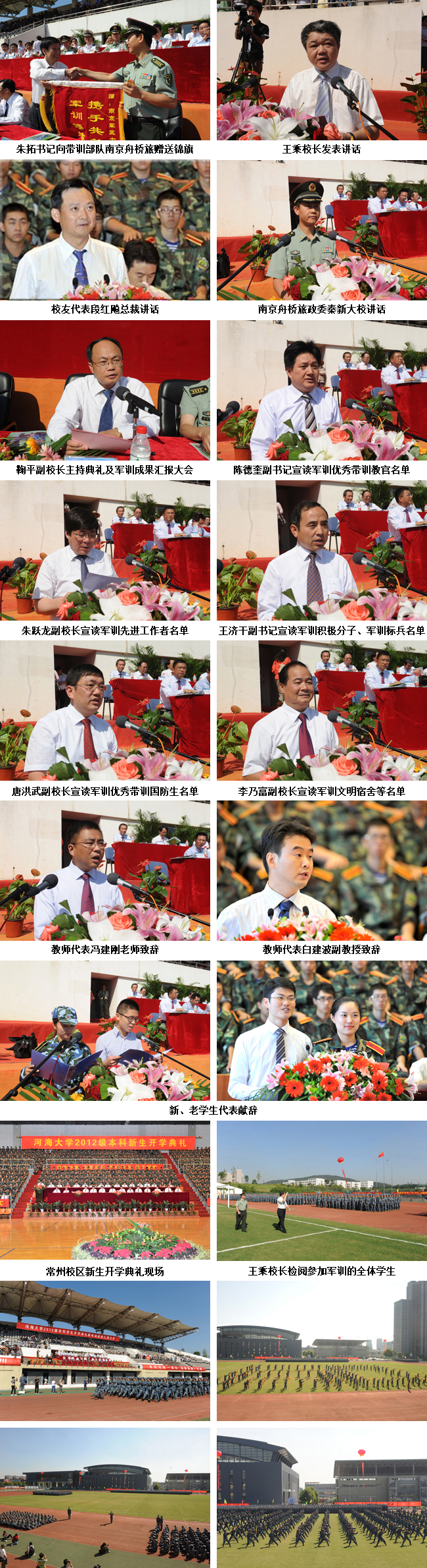 初秋时节,秋高气爽,丹桂飘香,草木竞荣。9月15日,河海大学隆重举行2012级本科新生开学典礼暨军训成果汇报大会。河海大学杰出校友、新华海科技产业集团有限公司段红飚总裁,南京军区学生军训办常务副主任崔本乐大校,南京舟桥旅政委秦新大校,南京军区国防动员委员会综合办秘书处副处长沈厚华中校,江苏省教育厅体卫艺处时文山副处长,南京舟桥旅副政委金宏上校,舟桥旅政治部副主任王占尧中校应邀出席;我校党委书记朱拓,校长王乘,中国工程院王超院士,副校长鞠平,党委副书记陈德奎,副校长朱跃龙,党委副书记王济干,副校长唐洪武,副校长李乃富,海军国防生选培办主任乔光玉大校,全国教学名师奖获得者武清玺教授,各学院领导及相关部门负责人参加了大会。大会由鞠平副校长主持。