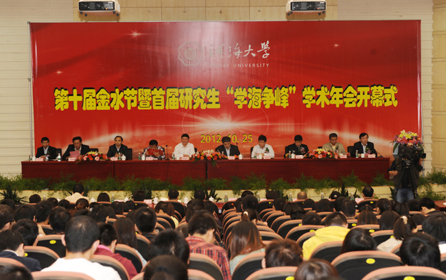 近日,河海大学第十届“金水节”暨首届研究生“学海争锋”学术年会开幕。江苏省教育厅副厅长、省委教育工委副书记胡金波,南京市科协副主席兼秘书长沈平,校长、研究生院院长王乘,副校长朱跃龙,校党委副书记王济干,海军驻河海大学选培办主任乔光玉大校出席开幕式。