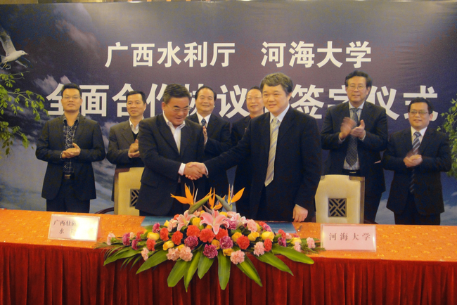 12月2日,我校与广西水利厅签订全面合作协议。河海大学校长王乘和广西水利厅厅长杨焱共同在协议书上签字。河海大学副校长李乃富、广西水利厅副厅长蔡德所、总规划师伍伟星等出席签字仪式。