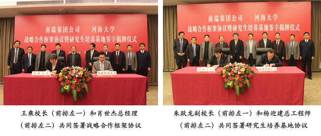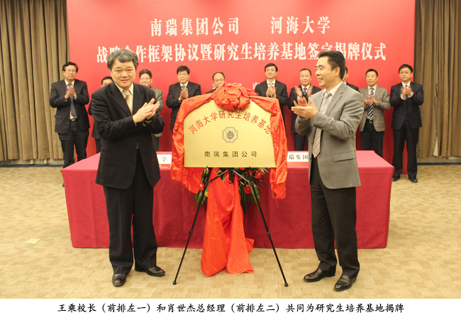12月3日,河海大学与南瑞集团公司签订战略合作框架协议暨共建研究生培养基地签约暨揭牌仪式在南京举行,河海大学校长、研究生院院长王乘和南瑞集团公司总经理肖世杰共同签署战略合作框架协议,并为研究生培养基地揭牌,河海大学副校长朱跃龙和南瑞集团总工程师杨迎建共同签署研究生培养基地协议。