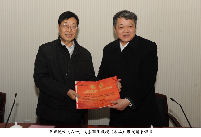 王乘校长向索丽生教授颁发赠书证书。王校长代表学校感谢索丽生教授长期以来对学校的关心和支持,他强调索丽生教授向学校赠书对我校的教育教学、科学研究工作起到积极的促进作用,希望全体师生共同学习索教授心系教育、无私奉献的精神,以书为伴,以书为友,敬岗爱业、勤奋学习,以优异的成绩报效祖国。