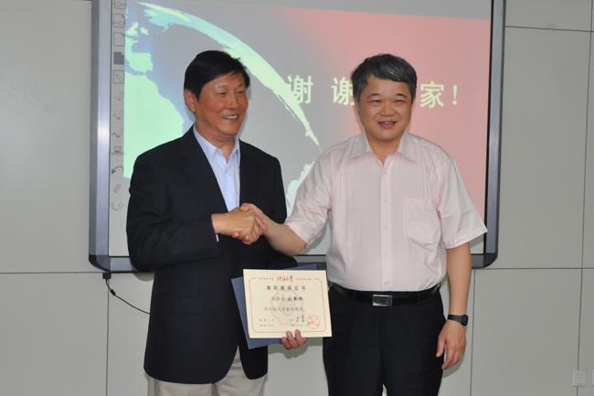 王乘校长(右一)为刘新权教授(右二)颁发聘书