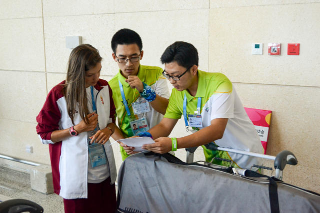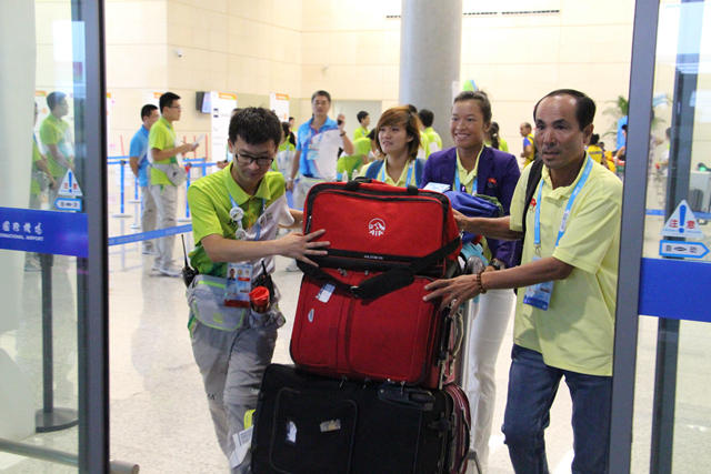 由于代表团行李较多,且比赛用枪弹、船桨、自行车等超规行李需要通过物流专送,加上行李丢失、注册信息不符等特殊情况,从飞机落地到运动员坐上开往官方酒店的大巴,接待一个团前后需要一个半到两个小时的时间,再加上由于流量控制、飞机晚点等因素的影响,志愿者有时要工作到凌晨五点。这对志愿者不仅是对志愿者能力和素质的考验,还是体力和意志的考验。尽管面临如此繁重的任务,志愿者们始终以最真诚的微笑、最周到的服务迎接四海宾朋。8月12日,在禄口机场服务的志愿者接待国家、地区和国际组织代表团59个、航班58架次、注册客户1231人;8月13日,接待代表团51个、航班67架次、注册客户1352人。