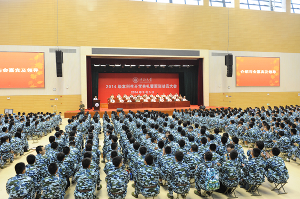 大会在庄严的国歌声中开始。徐辉校长发表了题为《心怀使命,绽放青春》的热情洋溢的讲话。徐校长代表全校师生向2014级新同学成功步入河海大学表示祝贺,并追溯了河海大学百年来治水报国和河海人献身时代的奋斗史,梳理了河海大学以及河海人肩负的特殊使命,希望广大新生力争成为“知识与能力兼备、智商与情商兼备、素质与作风兼备”的人,并做到:紧扣时代主题,以积极的心态回应社会的期待;找准人生坐标,在实践历练中实现人生价值;练就过硬本领,到最需要的地方去施展聪明才智;养成健全人 格,以健康向上的身心迎接未来挑战。