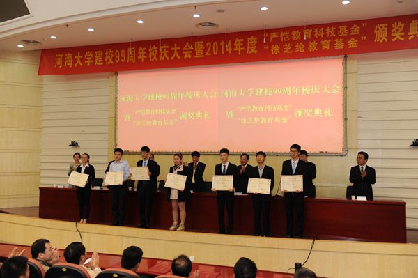 鞠平副校长宣读了《关于公布2014年度“严恺教育科技基金”和”徐芝纶教育基金”有关奖项获奖人员的通知》。校领导为63名获奖者颁发了荣誉证书。