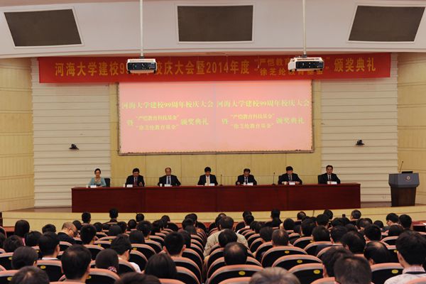 10月27日,我校举行河海大学建校九十九周年校庆大会暨2014年度“严恺教育科技基金”和“徐芝纶教育基金”颁奖典礼。校党委书记朱拓、校长徐辉、副校长鞠平、副校长朱跃龙、副校长唐洪武、党委副书记郭继超、副校长陈星莺出席大会。大会由副校长唐洪武主持。