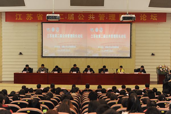 11月22日,江苏省第二届公共管理院长论坛在河海大学举行。江苏省教育厅苏春海副厅长、河海大学副校长朱跃龙,南京大学政府管理学院院长张凤阳,苏州大学政治与公共管理学院院长金太军,南京农业大学公共管理学院院长石晓平,中国矿业大学文法学院院长段鑫星等领导和专家出席了本次论坛。