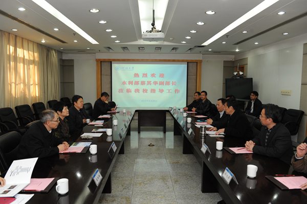 蔡其华副部长听取了校党委书记朱拓、校长徐辉关于学校近期工作的汇报,充分肯定了学校取得的成绩。她表示,时隔三年又一次来到河海大学,再次感受到百年河海深厚的文化积淀。长期以来,河海大学始终以服务国家发展、促进国家建设为己任,培养造就一大批水利水电高级技术和管理人才,为我国的水利水电事业发展作出突出的贡献。特别是近几年,河海大学以高水平特色研究型大学建设为目标,坚持面向国家需求,整合资源,推进优势学科发展,围绕自身特色服务行业建设,逐步成长为我国办学规模最大、综合实力最强的水利高等院校。
