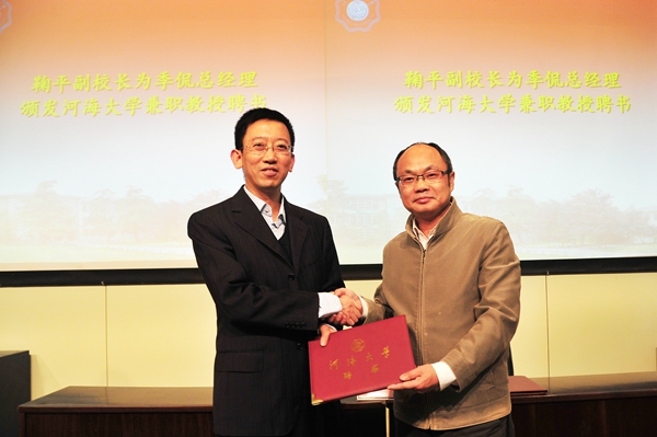 鞠平副校长为季侃校友颁发河海大学兼职教授聘书,并共同为“河海大学-国电南瑞配用电与新能源工程技术产学研联合研发中心”揭牌。陈星莺副校长对季侃校友一行的到来表示欢迎,并介绍了季侃校友的学习、工作经历。季侃校友对校企合作和共同发展提出了建议,力争为电力建设和母校繁荣增光添彩。