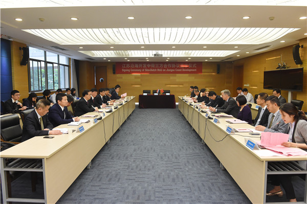 6月5日,江苏省沿海开发集团、河海大学、荷兰三角洲研究院在南京举行江苏沿海开发中荷三方合作协议签字仪式暨国际学术研讨会。江苏省委组织部副部长和省人才办主任胡金波、河海大学党委书记朱拓、江苏省沿海开发集团董事长邓东升出席仪式并致辞,江苏省沿海开发集团董事长邓东升、河海大学副校长朱跃龙、荷兰三角洲研究院亚太区总监启特·纳塔签署了三方合作协议,江苏省沿海开发集团总经理丁建奇主持签字仪式。出席仪式的还有荷兰驻华大使馆基础设施和环境参赞魏安娜女士,江苏省省委组织部董德处长,江苏省外事办公室国际交流中心吴忠德主任。