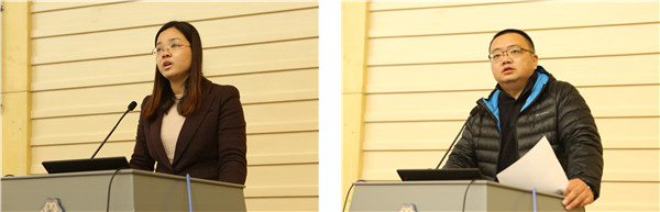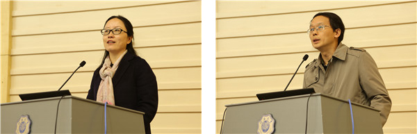 水电学院党委副书记戴玉珍(左)、商学院党委书记蒲晓东(右)作就业工作交流发言