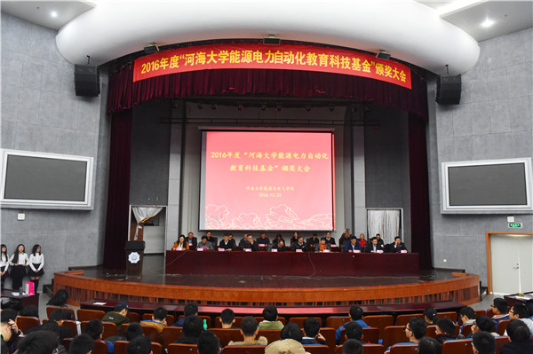 河海大学百年校庆之际,能源、电力、自动化校友为支持母校发展,纷纷筹资捐款,截至今年初,能源与电气学院共收到捐赠款241.12583万元,并于2015年12月12日设立“河海大学能源电力自动化教育科技基金”,旨在继承和弘扬能源、电力、自动化学科老一辈开拓者优良传统和作风,促进我校能源、电力、自动化学科发展,以及资助相关专业在校贫困学生顺利完成学业和支持学校人才培养。基金下设奖学金、助学金和教育科技贡献奖等奖项。依据学校颁布的《河海大学能源电力自动化教育科技基金管理办法》,2016年共评选出漆家炜等12名“河海大学能源电力教育科技基金”奖学金获得者,陈小宇等20名“河海大学能源电力教育科技基金”助学金获得者,李九虎校友、邵宜祥校友、王宏华教授等3名“河海大学能源电力教育科技基金”科技贡献奖获得者。