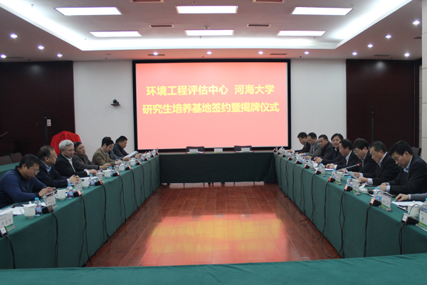 2月23日,河海大学与环境保护部环境工程评估中心举行研究生培养基地签约暨揭牌仪式。河海大学校长徐辉和环境保护部环境工程评估中心主任谭民强共同为研究生培养基地揭牌,副校长朱跃龙与评估中心副总工程师陈凯麒签署《环境保护部环境工程评估中心-河海大学关于建设研究生培养基地的协议》。