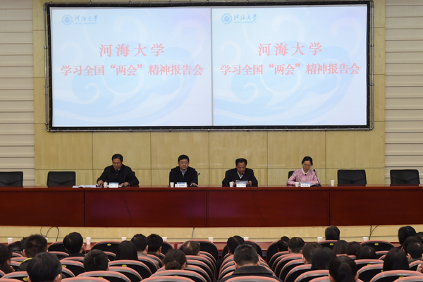 3月17日下午,河海大学召开学习宣传贯彻全国“两会”精神报告会。校党委书记唐洪武出席会议并讲话,校长徐辉主持会议。全国政协委员、副校长王超、陈星莺传达2017年全国“两会”精神。