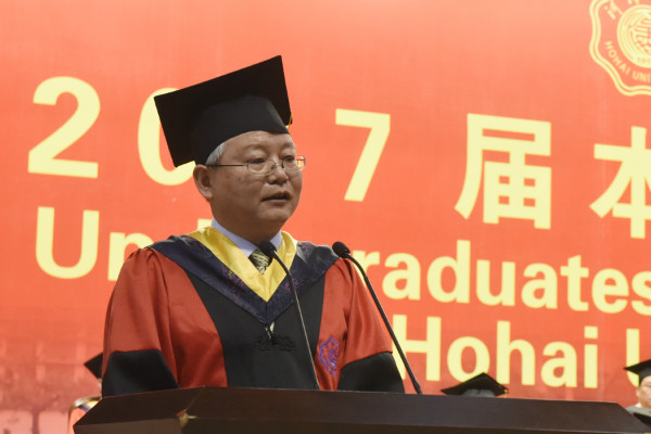 毕业典礼上,徐辉校长发表了题为《同心奋进 自我超越》的演讲,向奋力拼搏、学有所成的各位同学表示最热烈的祝贺!向悉心培育毕业生成长成才的各位老师和家长致以崇高的敬意和诚挚的问候!徐校长说,四年的时光转瞬即逝,同学们以梦为马,不负韶华,劈波斩浪,坚定前行。他以“进取心”为主题和同学们分享了所思所得,他指出,百年河海从开启中国水利高等教育之先河到20万河海人桃李芬芳遍天下,代代河海人始终以不辜负国家和社会期许为己任,志坚前行,躬身实践,在国家建设最需要的地方留下了最难忘的铿锵足迹。新时代的河海人,理应在祖国的四面八方、在国民经济的各个领域,同心奋进,自我超越,为中华民族的伟大复兴发挥更加重要的作用,让生命在不断进取中发热和闪光。徐辉校长强调,进取的路上要找准人生方向,青年人要树立起坚定正确的理想信念和目标,激发起旺盛的求知欲、强烈的好奇心和努力上进的精神动力;进取的路上要明确行动路线,从时代主题出发,同心同向谋划事业和工作;进取的路上要做到全力以赴,学会用“追求卓越”这块磨石砥砺自我;进取的路上要不断超越自我,始终保持创造性张力,以一种积极的态度对待生活,自动自发地争取最大的进步。在百年河海全面推进“双一流”建设的征程中,河海学子们也正翻开人生的崭新篇章,徐辉校长勉励毕业生们同心奋进,实现新跨越,共创新辉煌!