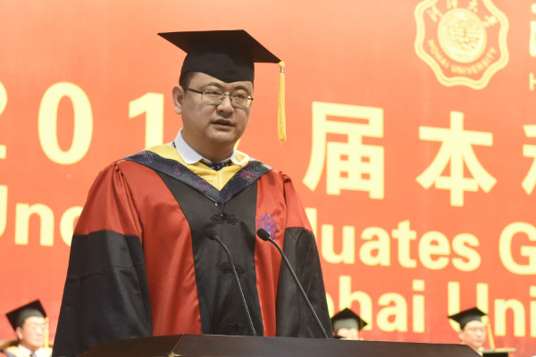 毕业生代表企业管理学院工商管理专业周璟维、在校生代表物联网工程学院2014级通信工程专业胡金鹏献词