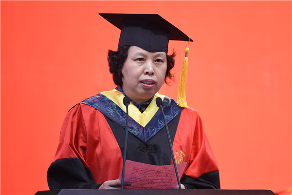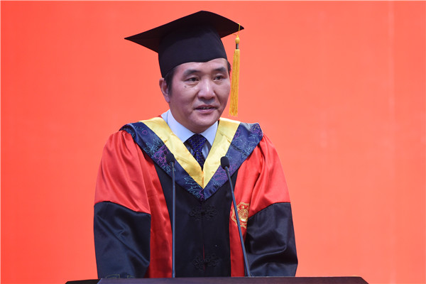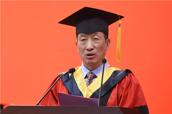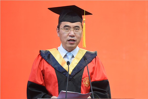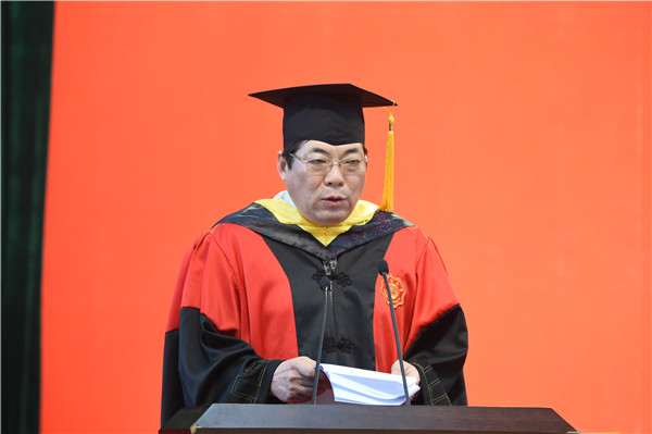 典礼上,徐辉校长发表了《坚定理想信念,谱写青春乐章》的演讲,向顺利完成学业的各位同学表示热烈的祝贺,向养育、培养其成才的父母、老师致以最诚挚的感谢。徐校长以“坚定理想信念”为主题,寄语广大毕业研究生树立与实现中华民族伟大复兴的中国梦这个时代主题同心同向的理想信念,为国家富强、人民幸福而挥洒青春汗水、成就一番事业。徐校长希望广大研究生不忘初心、胸怀理想、志存高远,忠于信念,坚持做到:一是坚定理想信念,铸牢人生之路的精神支柱。要学会用理想信念滋养思想与人格,用理想信念激荡灵魂与心智,用理想信念孕育新的精神与智慧,定位成功;二是坚定理想信念,奠定修身立业的坚实基础。把理想信念铸入思想、融入灵魂、见之于行,抵抗住各种诱惑,做到严以修身,不断在工作中注入强大的信心,摆正心态,迸发激情与活力,创造出更多的成果,推动自身的事业不断发展;三是坚定理想信念,夯实幸福生活的重要支撑。要能正确对待一时的成败得失,处优而不养尊,受挫而不短志,要满怀理想,沿着这个时代希望的方向拼搏向前,激发蕴藏在体内的巨大潜能,迎接幸福美好的生活。