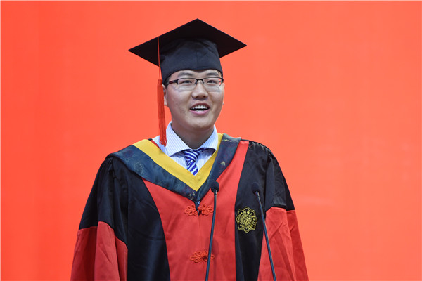 毕业研究生代表梁英杰结合自身求学经历表达了全体毕业研究生对母校的依依惜别之情和对老师的深深感激,他表示要时刻铭记“河海人”所肩负的使命与责任,不论身处怎样的工作环境,面对怎样的工作挑战,用自己的实际行动诠释“艰苦朴素,实事求是,严格要求,勇于探索”的校训。