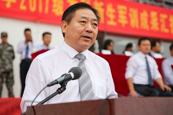 校党委副书记、2017级学生军训旅政委郭继超主持大会 校党委副书记孟新宣读军训先进工作者表彰决定和军训优秀带训国防生表彰决定 副校长许峰宣读军训两个标兵表彰决定 副校长、2017级学生军训旅旅长董增川发表讲话 副校长郑金海宣读了军训内务优秀宿舍表彰决定 副校长陆国宾宣读了军训优秀射手表彰决定
