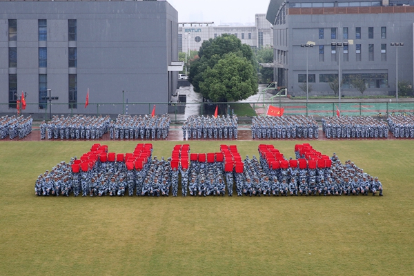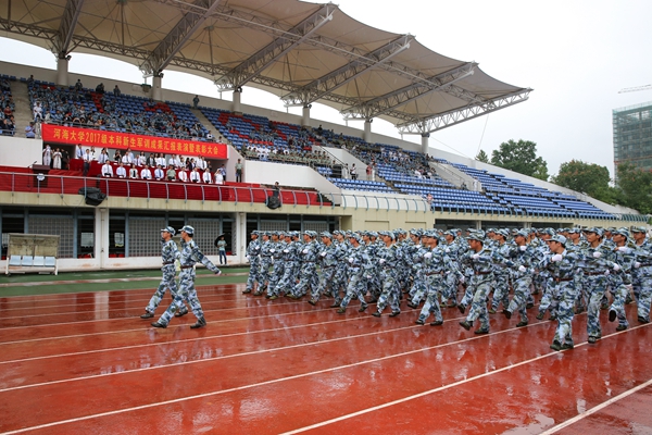 斗志昂扬的2017级新生喊着铿锵有力的口号,13个方队在雨中踏着整齐的步伐步入会场,接受全校师生的检阅,展现他们训练多日的成果。高昂的热情,标准的动作,飒爽的英姿,充分体现了同学们拼搏奋进的意志,健康向上的精神。精彩的表现赢得了在场领导、嘉宾、承训部队官兵和师生的一致好评。分列式结束后,同学们仍然坚持在雨中进行了男生军体拳、女生军体拳、女生防身术和男生匕首操汇报表演。