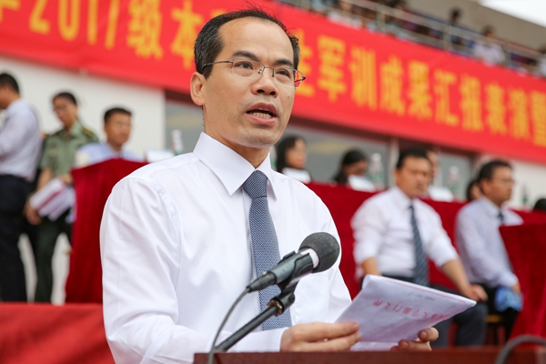 大会在庄严的国歌声中开始。会上,校党委书记唐洪武向承训部队赠送了锦旗,向全体教官在军训中的辛苦付出表示了由衷的感谢。校长徐辉宣布2017级学生军训阅兵开始。