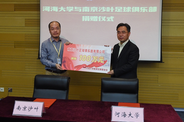 郭继超副书记和张辰龙董事长代表双方单位共同签署了校企合作框架协议。会上,南京沙叶足球俱乐部向河海大学教育发展基金会捐赠100万元,用于河海大学足球队的建设与发展。同时又向我校捐赠了新赛季球衣,寓意球队在以后的比赛中取得佳绩。