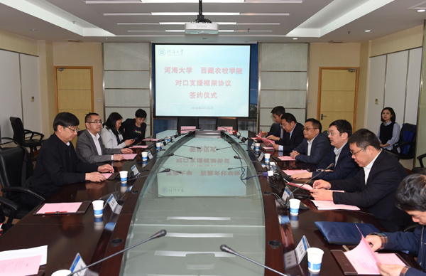 近日,河海大学与西藏农牧学院对口支援框架协议签约仪式在我校举行。河海大学党委书记唐洪武,西藏农牧学院党委副书记、院长高学出席签约仪式。签约仪式由副校长许峰主持。