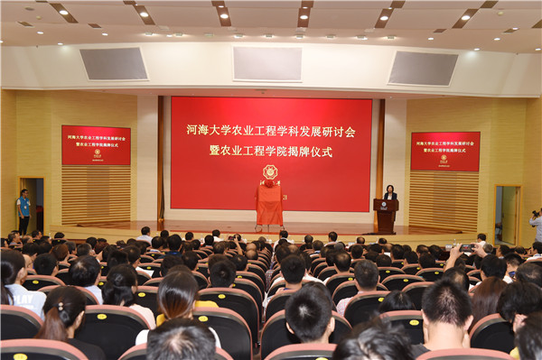 9月15日,河海大学在西康路校区隆重举行农业工程学科发展研讨会暨农业工程学院揭牌仪式。中国工程院院士茆智、中国工程院院士缪昌文、中国工程院院士王超、中国工程院院士康绍忠、中国工程院院士李天来、水利部农村水利水电司副司长张向群、农业农村部耕地质量监测保护中心处长李荣、中国灌区协会会长李仰斌、江苏省水利厅副厅长叶健,以及来自政府部门、兄弟院校、相关科研院所及企事业单位的50余名专家、领导和60余名校友代表应邀出席活动。校党委书记唐洪武,校长徐辉,副校长董增川,副校长郑金海,以及学校有关单位负责人、师生代表等参加活动。校党委副书记、纪委书记孟新主持活动。