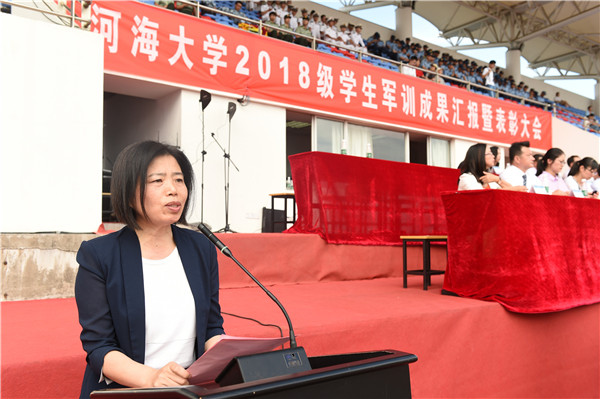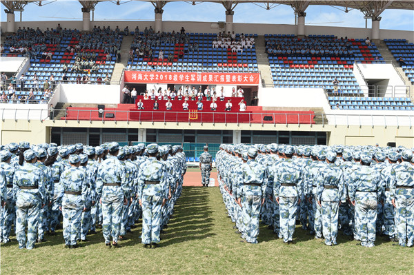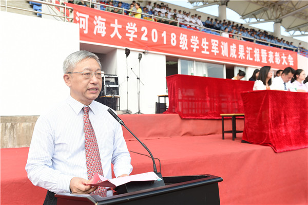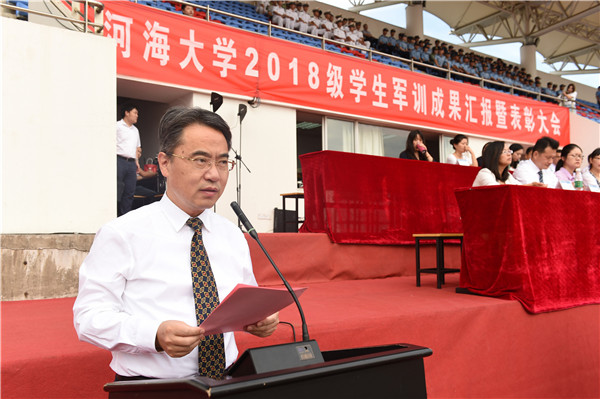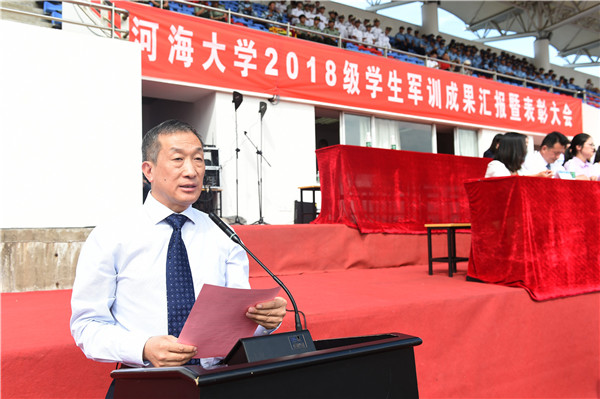 9月23日,我校隆重举行2018级学生军训成果汇报暨表彰大会。校长徐辉、校党委副书记郭继超、校总会计师张兵、校党委副书记孟新、副校长许峰、副校长董增川、海军国防生选培办主任乔光玉大校、承训部队中国人民解放军94994部队政委周小兵大校等领导和嘉宾出席大会。大会由校党委副书记、2018级学生军训旅政委郭继超主持。
