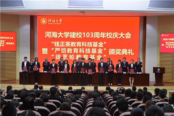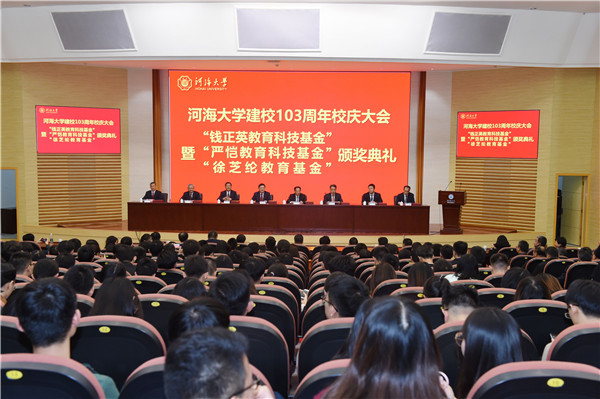 10月27日,我校举行建校103周年校庆大会暨“钱正英教育科技基金”“严恺教育科技基金”“徐芝纶教育基金”颁奖典礼。校党委书记唐洪武、校长徐辉、副校长徐卫亚、党委副书记郭继超、总会计师张兵、副校长许峰、副校长董增川、副校长郑金海出席大会。大会由唐洪武书记主持。