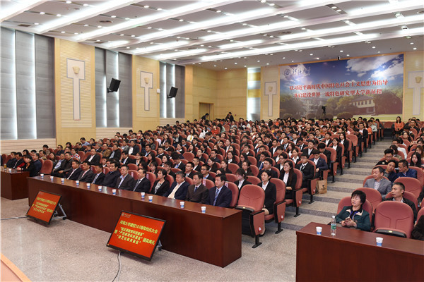 徐辉校长在讲话中指出,百年传承凝聚的河海精神,百年传统形成的河海文化,一脉相承、延绵至今,流贯于每个河海人的血液,影响和造就了一批批学术大师、行业翘楚和国家栋梁,成为学校服务经济社会发展和国家水利建设的力量源泉。他强调,一百零三年的发展历程中,河海人肩负“治水兴邦”的使命担当,坚持“毋负邦人期”的价值追求,艰苦创业、奋发砥砺、坚韧不拔,始终站在中国水利高等教育及科技的最前沿,把成果书写在祖国大地上、应用在现代化建设伟大事业中。他表示,在新的起点上,我们要以习近平新时代中国特色社会主义思想为指引,振奋精神、勇攀高峰,以全面深化改革为抓手,以体制机制创新为动力,以资源条件建设为保障,加快推进“双一流”建设,以新时代奋进之笔书写学校新百年发展的华丽篇章。