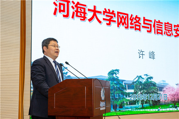 许峰副校长从强化网络信息安全意识、健全网络信息安全机构,完善网络信息安全管理制度、提升网络信息安全防护能力四个层面,系统介绍河海大学网络信息安全的工作情况。