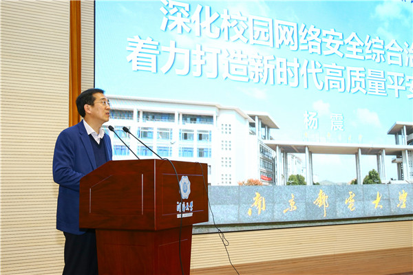 全国人大常委、中国农工民主党中央副主席、南京邮电大学校长、省信息网络安全协会副会长杨震,从高校网络安全的重要意义、面临的风险挑战、突出的重点任务、应对的有效措施四个方面作了主题演讲。