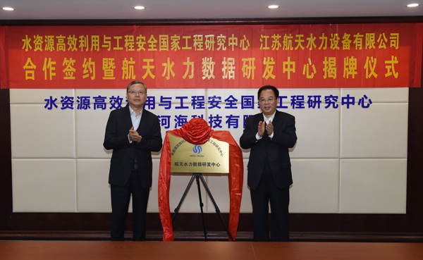 12月28日,水资源高效利用与工程安全国家工程研究中心与江苏航天水力设备有限公司举行合作签约暨航天水力数据研发中心揭牌仪式。中国航天科技集团科技委副主任、航天六院科技委主任谭永华,江苏航天水力设备有限公司总经理李彦喜、副总经理邵春兵,河海大学校长徐辉,河海大学副校长、水资源高效利用与工程安全国家工程研究中心主任郑金海等出席仪式。徐辉校长与谭永华主任共同为航天水力数据研发中心揭牌,水资源高效利用与工程安全国家工程研究中心常务副主任陈达与李彦喜总经理签署合作协议。郑金海副校长主持仪式。