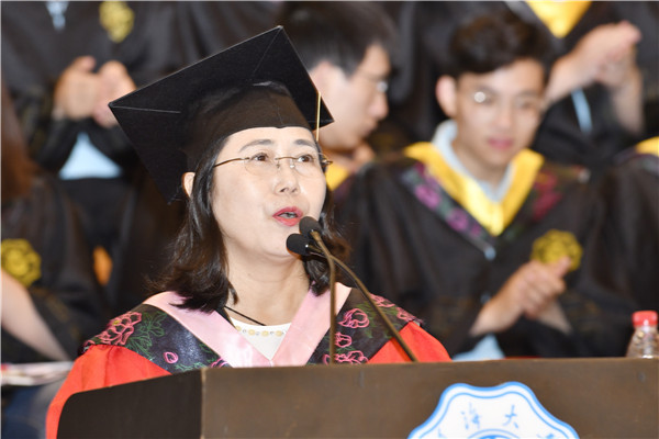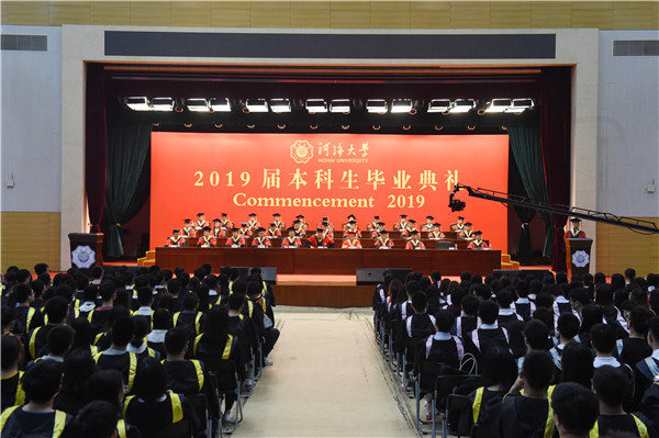 对于即将开启人生新征程的同学们,徐辉校长强调,身处一个伟大的时代,党和国家对青年人才的渴求比任何时候都要迫切,国家的富强、民族的复兴离不开你们的不懈奋斗。他对广大毕业生提出三点希望:一是志存高远、开拓人生格局,以新中国成立70周年为新起点,以“毋负邦人期”为己任,大力弘扬爱国主义精神,坚定崇高的人生理想,涵养深厚的家国情怀,着力拓宽视野,志存高远,胸怀天下,把人生价值与中国特色社会主义事业高度融合,形成同国家、民族乃至人类命运共融的大爱格局;二是厚德载物、承载使命担当,锻造“上善若水”的优秀品质,保持敢于担当、勇于担当的精神状态,面对大是大非敢于亮剑,面对艰难困苦敢于迎难而上,刚健有为、自强不息,承担起新时代赋予的新使命;三是不负重托、争当时代先锋,不辜负党的期望、人民期待、民族重托,秉持校训精神,在“三大攻坚战”中勇于冲锋在前,在“五位一体”总体布局、“四个全面”战略布局中奋斗建功,在发展新技术、新产业、新模式、新业态中充分彰显创造活力,为推动国家乃至全球进步贡献河海力量。徐辉校长表示,母校永远是每一位毕业生的坚强后盾,衷心祝愿大家前程似锦,一生平安幸福!