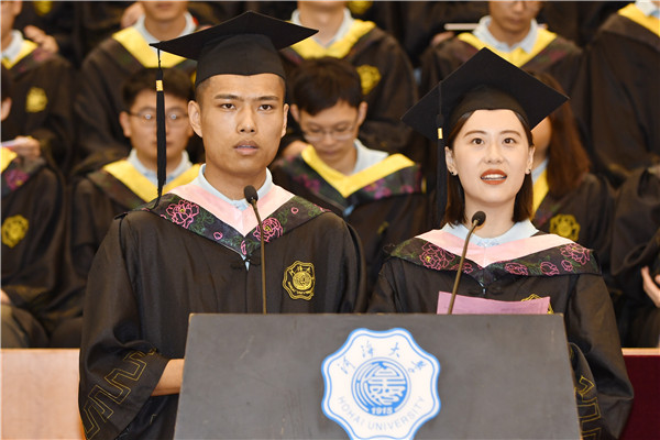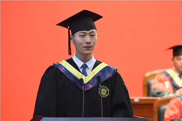 毕业生代表土木与交通学院李升涛、企业管理学院董济昊和周玮表达了对母校的依依惜别之情和对老师的感激之情,表示将时刻铭记校训精神,秉持河海精神,不忘初心,砥砺前行。