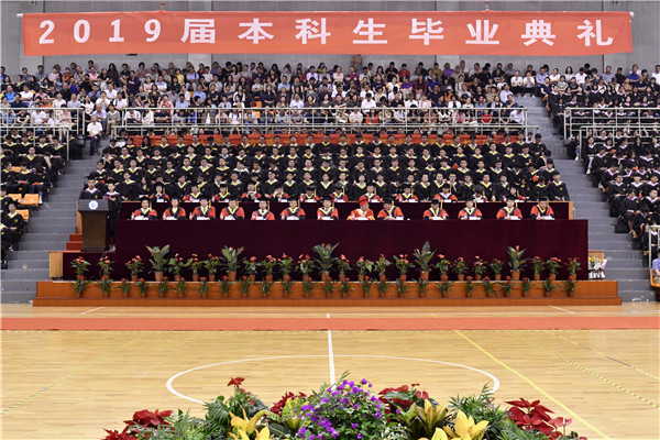 6月19日,我校隆重举行2019届本科生毕业典礼。河海大学杰出校友、南京水利科学研究院陈生水院长,老挝国家电力公司戈莫占副总经理,中国电建昆明勘测设计研究院杨光亮副总经理作为特邀嘉宾出席毕业典礼。校党委书记唐洪武,校长徐辉,副校长徐卫亚,校党委副书记郭继超,校总会计师张兵,副校长许峰,副校长郑金海,各学院及各有关部门负责人,四千余名本科毕业生以及学生家长参加了典礼。董增川副校长主持典礼。