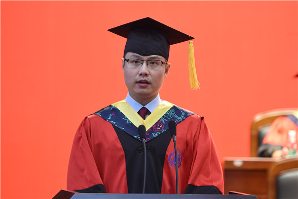 教师代表沈扬教授和纪玲妹教授向毕业生们顺利完成学业表示祝贺,对毕业生为母校付出的努力和做出的贡献表示感谢,并寄语毕业生百舸争流,不断学习、永远奋斗;勠力同舟,立德修身、锻造品格;逆水行舟,守住初心、笃实而行。