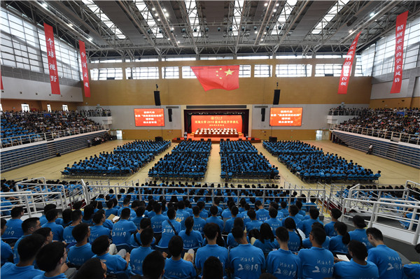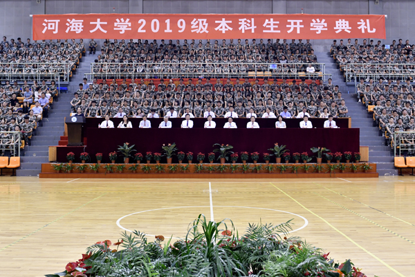 大会在庄严的国歌声中开始。徐辉校长首先发表题为《青春当奋斗,不负青云志》的讲话。徐辉校长代表全校师生向2019级新同学的到来表示衷心祝贺和热烈欢迎。他说,今天的中国,正朝着实现中华民族伟大复兴的宏伟目标奋勇前进,作为承前启后的新时代青年学子,无比幸运和荣耀。他指出,河海大学是中国水利高等教育的开创者,始终与国家同命运,与时代共发展,将培养担当时代和社会发展责任的人才,作为永恒的使命和追求。广大新生作为河海的新主人,是百年河海源远流长之“本”,河海的特质要靠你们来传承和弘扬,河海的未来更要靠你们去书写和创造。徐辉校长对广大新生提出三点要求和希望:一是要坚守一颗爱国心。广大新同学有幸共赴民族复兴的伟大征程,这是建功立业的历史际遇,也是大展才华的时代舞台,希望大家继续发扬五四精神,涵养爱国情、锻造强国志,秉承治水兴邦的使命担当和毋负邦人期的价值追求,不辜负党的期望、人民期待、民族重托,不辜负这个伟大时代。二是要永葆一颗奋斗心。幸福都是奋斗出来的,新时代中国青年一定要继承和发扬光荣传统,让“永久奋斗”成为最鲜明的青春底色,要求真学问、练真本领、做实干家,要践行“艰苦朴素、实事求是、严格要求、勇于探索”的校训精神,努力做到“知识与能力兼备、智商与情商兼备、素质与作风兼备”。三是要常怀一颗感恩心。只有懂得感恩,才能胸中有大众、心中有社会,才知道回报社会、回报祖国、回报人民,才会在利益面前以祖国为重先公而后私,才能成为一个品德高尚、胸襟开阔、有益于社会和人民的人。徐辉校长表示学校将承担起立德树人的责任,努力为同学们的成长成才创造最好的条件,也希望广大新生通过自己的努力,铸就中国灵魂、培养全球视野、锻造河海特质,开创属于自己的天地。