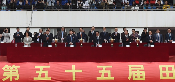 校党委书记唐洪武为获得最佳入场方队代表颁发奖杯。校长徐辉宣布河海大学第五十五届田径运动会暨第二十一届老年人运动会开幕。副校长徐卫亚宣布“最佳入场方队”评选结果。校党委副书记郭继超致开幕词。他指出,在过去的一年中,我校体育工作和体育文化建设成绩斐然。一年一度的校运会是体育教育宣传和动员的重要舞台,我们要认真贯彻落实党中央关于学校体育工作的决策部署,加快推进体育强校,引导鼓励师生积极参加体育锻炼、发扬拼搏精神、活跃校园文化,把体育事业深刻融入到学校“双一流”建设的大格局中,在我校“双一流”建设的新征途上团结奋进,再创辉煌!
