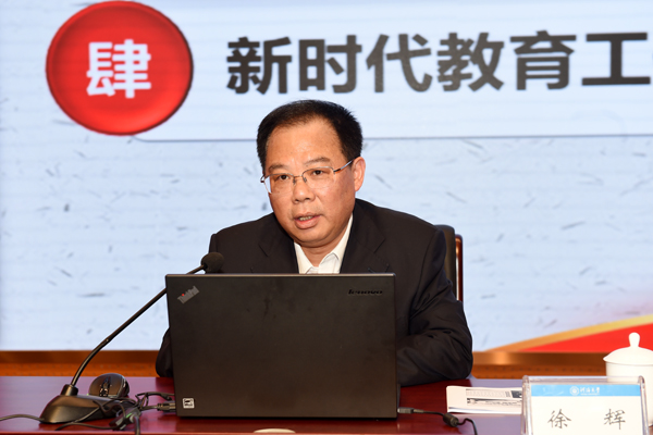11月9日上午,徐辉校长以《新时代教育工作者的使命与担当》为题讲授“不忘初心、牢记使命”主题教育专题党课。教育部直属高校主题教育第七巡回指导组组长李廉、成员王琦出席,全校党员骨干教师二百余人听了专题党课。