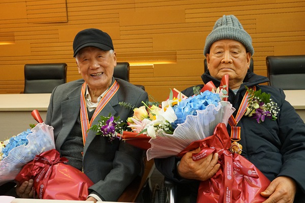 荣获“中国人民志愿军抗美援朝出国作战70周年”纪念章的肖祯祥、冯世治二位老同志合影