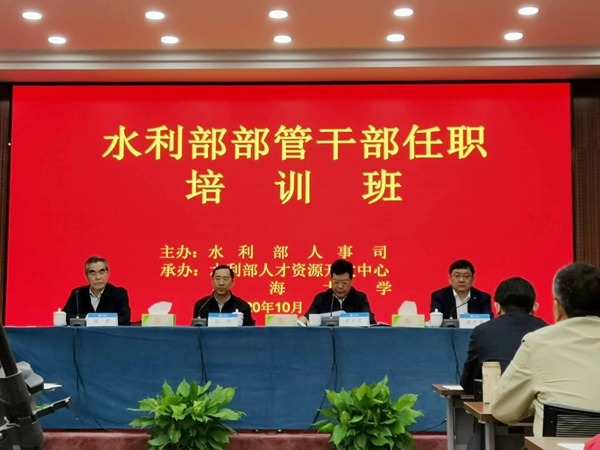 10月27日,水利部部管干部任职培训班在河海大学开班。中央纪委国家监委驻水利部纪检监察组组长、水利部党组成员田野,水利部人事司司长侯京民,水利部人才资源开发中心主任、水利部党校专职副校长陈楚,河海大学党委书记唐洪武等出席开班仪式,开班仪式由水利部人事司司长侯京民主持。